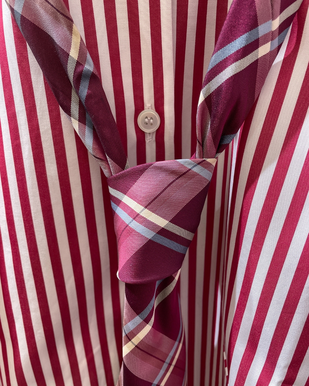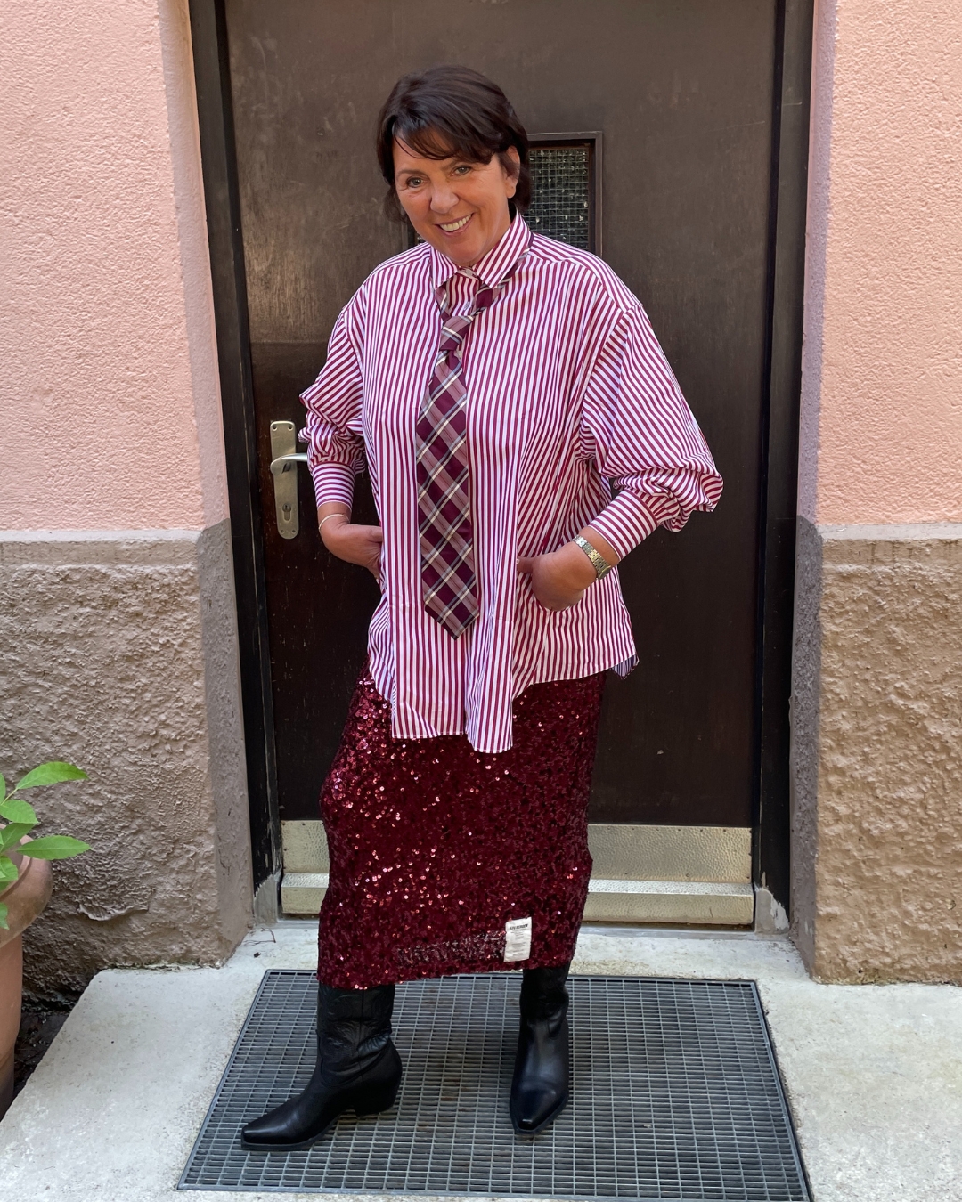 Zu der rotgestreiften Bluse mit Taschen passt diese Krawatte aus unserem Schatz und der Pailetten Rock von liv bergen.