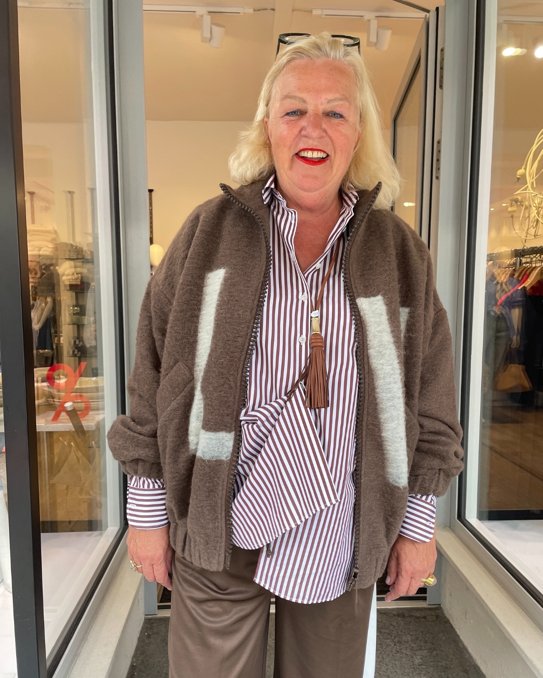 Braun ist in diesem Herbst eine der Farbe an denen Ihr nicht vorbei kommt. Jutta trägt braun weiße Streifen zur Jacke und Hose von liv bergen.