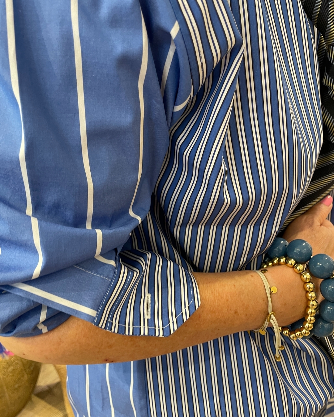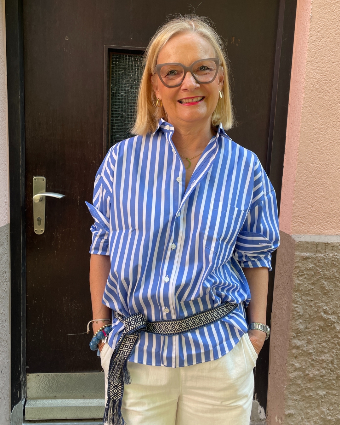Besonders haben es uns die Streifen angetan. Angela trägt eine Bluse mit schmalen Streifen vorne und an der Manschette und breiteren Streifen am Rücken und den Ärmeln.