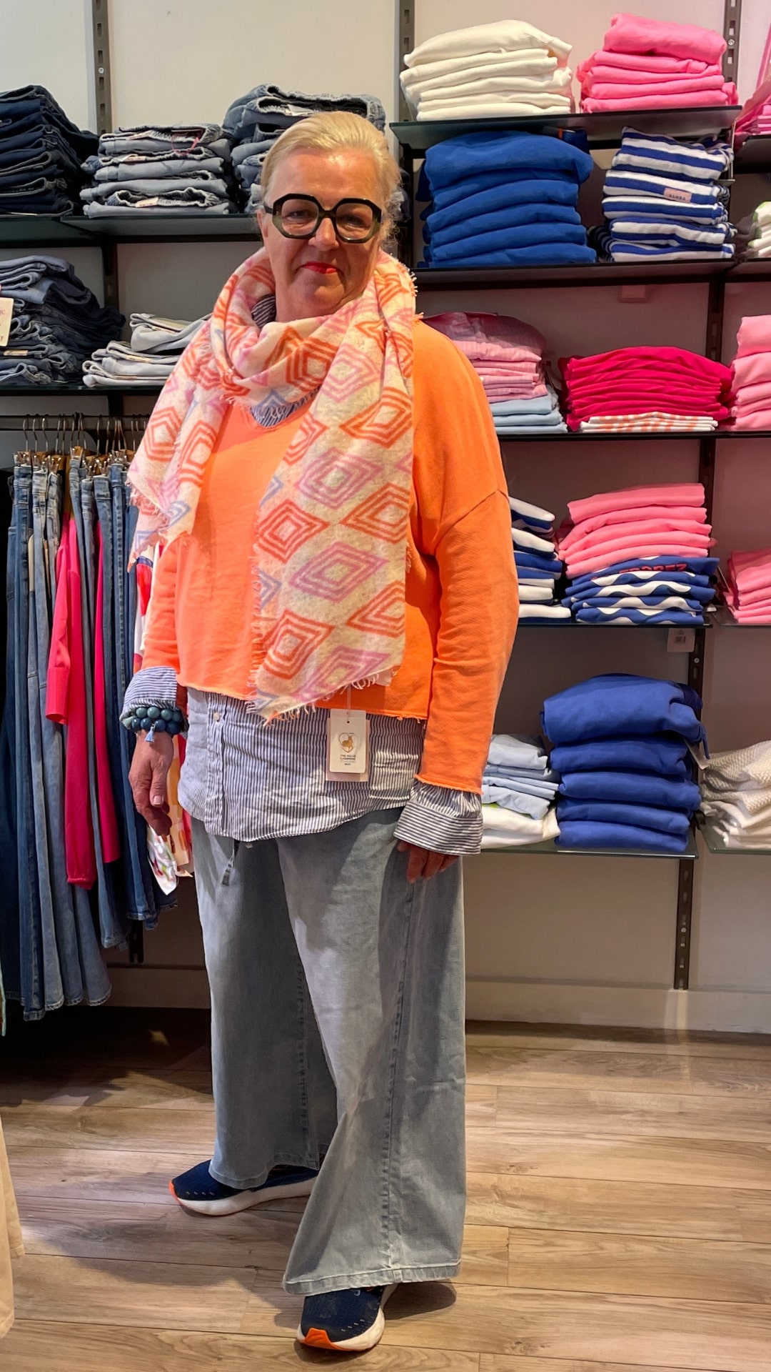 Die helle, weite Jeans mit Cordel wird mit der blau/weiß gestreiften Bluse und dem Neon Sweatshirt zum lässigen Alltagsoutfit.